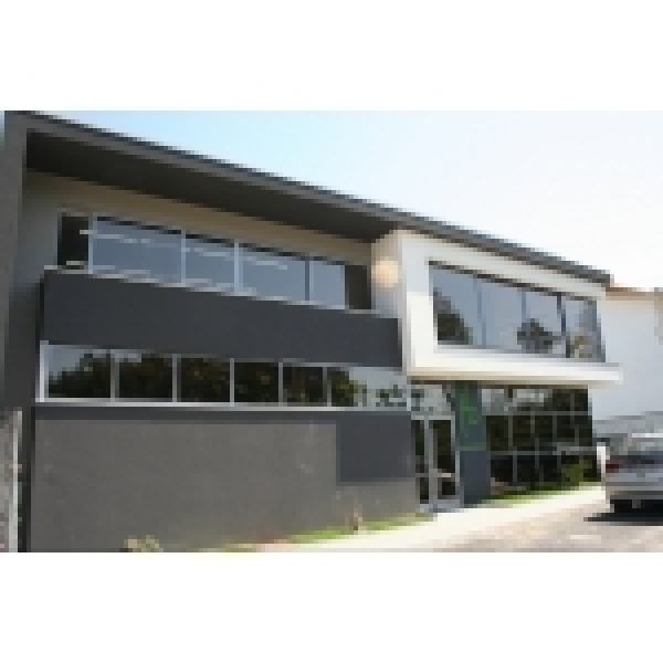 Fachada de edifício em perfil semi-estrutural com janelas projectantes;